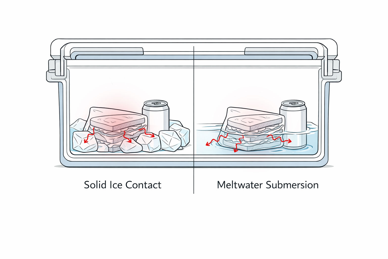 In short: The cooling method shifts from “solid ice contact” to “submersion in meltwater.”